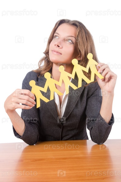 Бизнес-леди с бумажными людьми на белом фоне