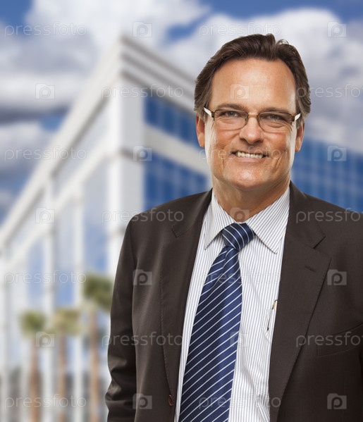 Красивый улыбающийся бизнесмен перед зданием