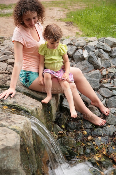 Мама с дочерью смотрят на маленький водопад