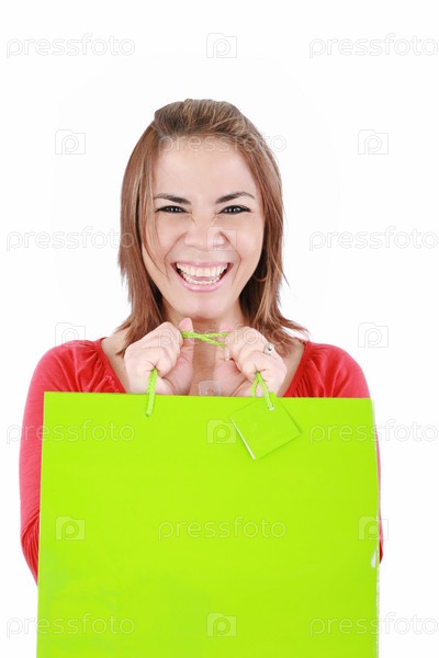 Молодая женщина с пакетом на белом фоне