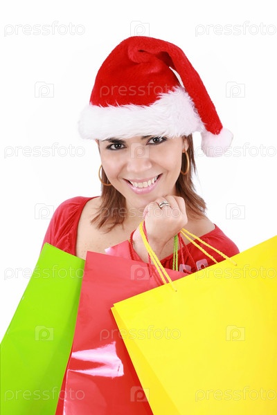 Счастливая женщина в шапке Санта-Клауса с пакетами на белом фоне