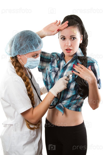 Женщина-врач или медсестра осматривает молодую пациентку с помощью стетоскопа на белом фоне