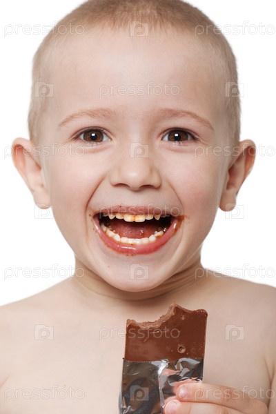 Маленький мальчик-сластена с удовольствием ест шоколадку
