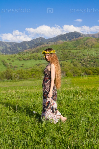 Красивая девушка в венке из одуванчиков на природе. Концепция весеннего отдыха