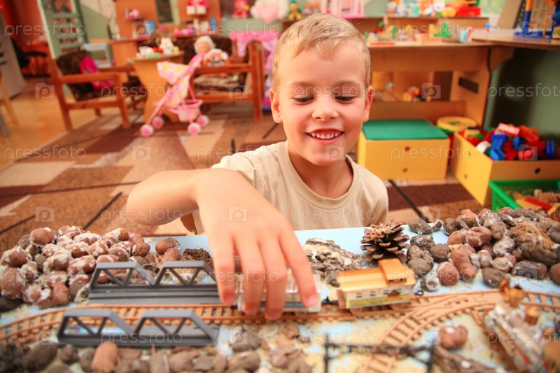 Мальчик играет с игрушечной железной дорогой, в игровой комнате