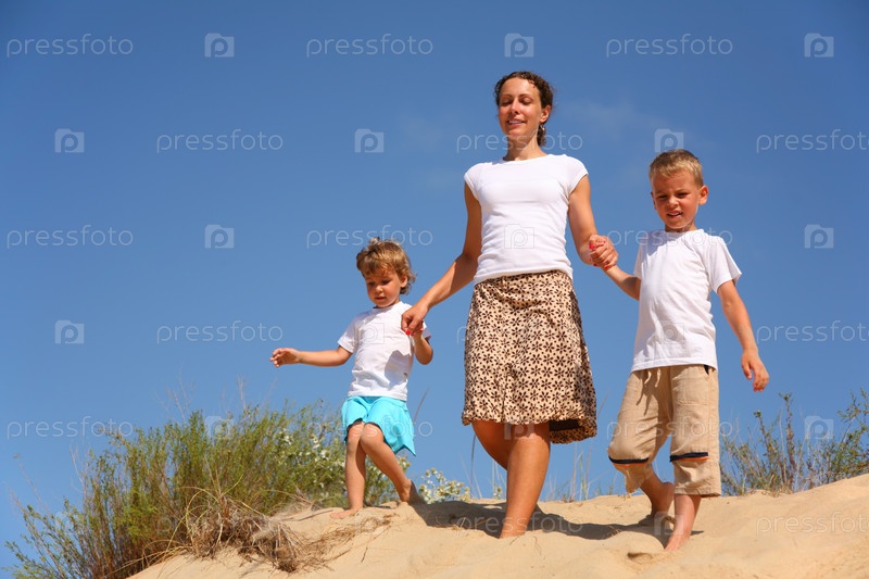 Мама с детьми идет по песку