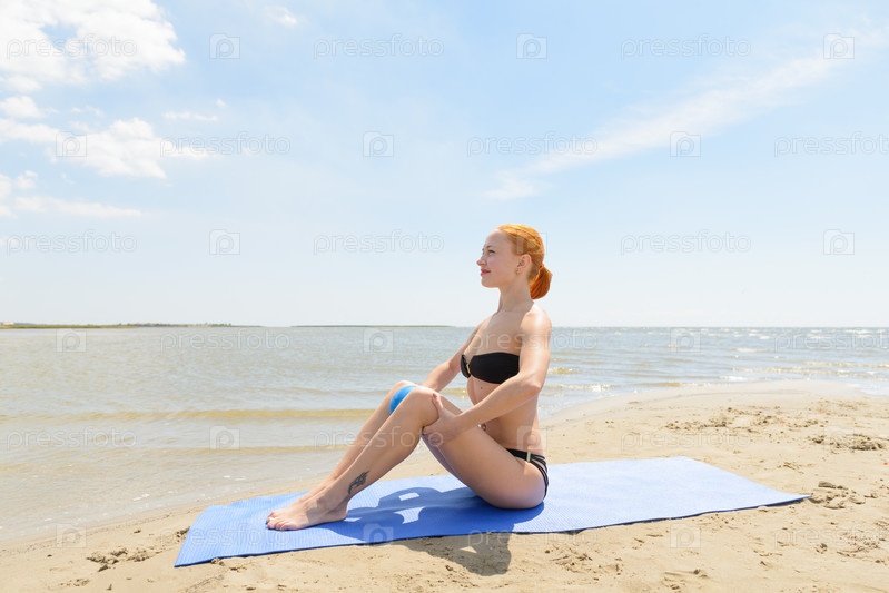 Красивая женщина занимается фитнесом на море