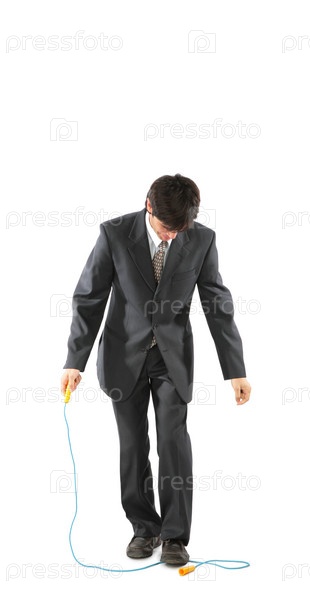 Бизнесмен, прыгающий через скакалку на белом фоне
