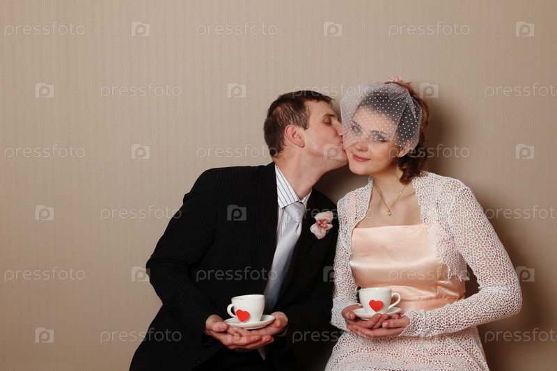 Молодожены держат чашку с сердечками