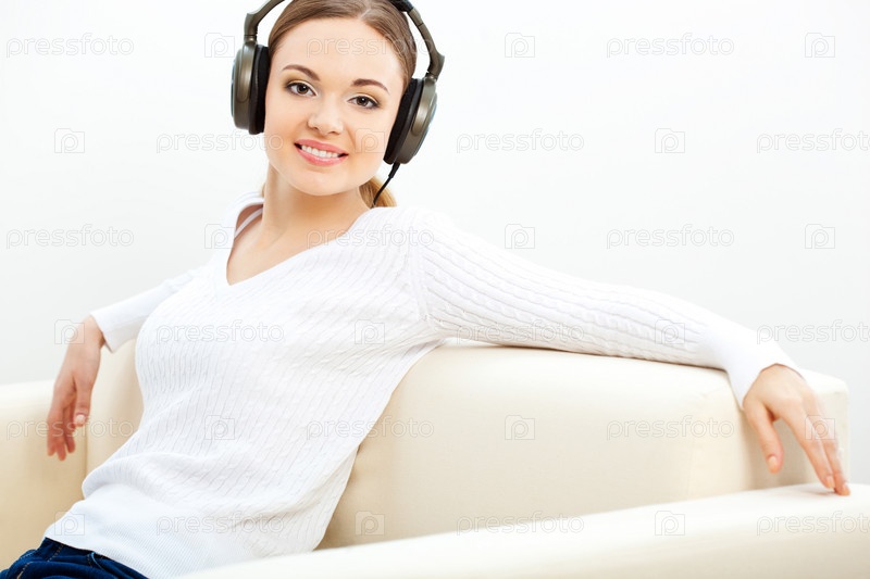 Женщина слушает музыку на диване