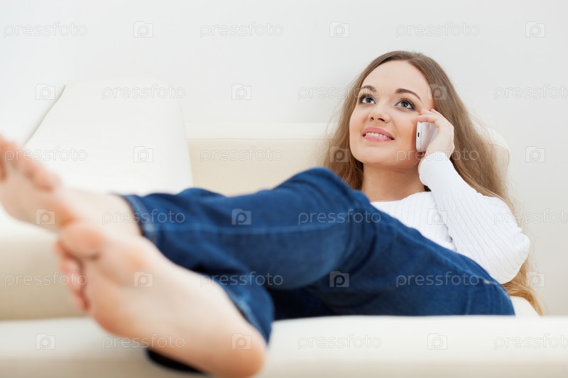 Женщинаи говорит по телефону, сидя на диване