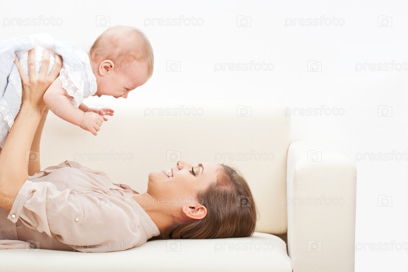 Мать и ребенок лежат на диване
