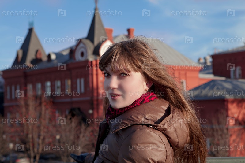 Красивая девушка с темными волосами в коричневом пальто