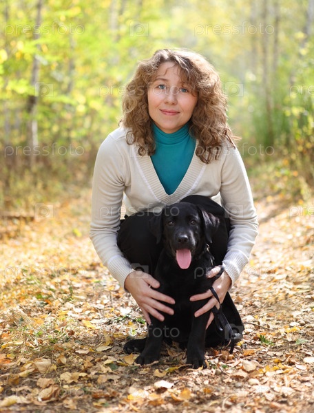 Молодая женщина с черным щенком лабрадора ретривера