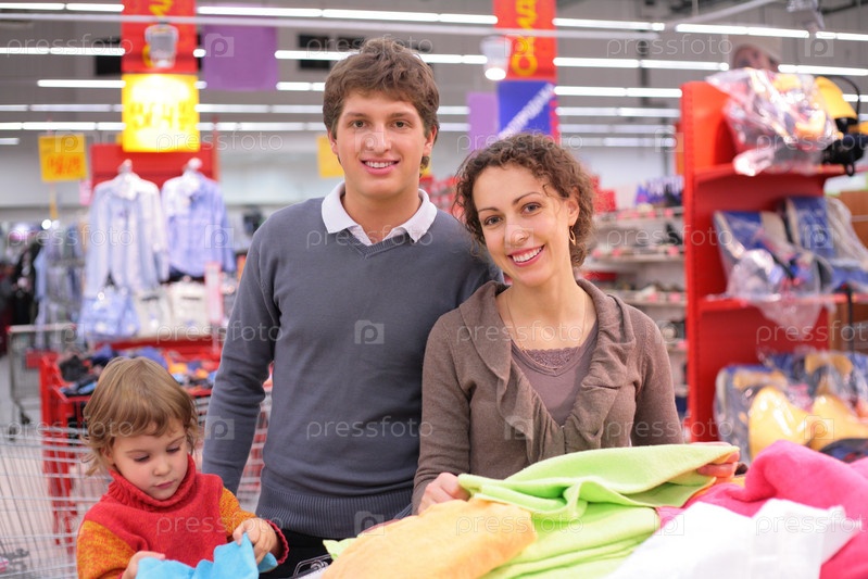 Родители с ребенком выбирают ткань в магазине