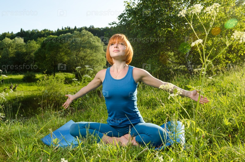 Рыжеволосая женщина занимается йогой на открытом воздухе