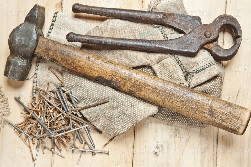 Старинный молоток с гвоздями на деревянном фоне