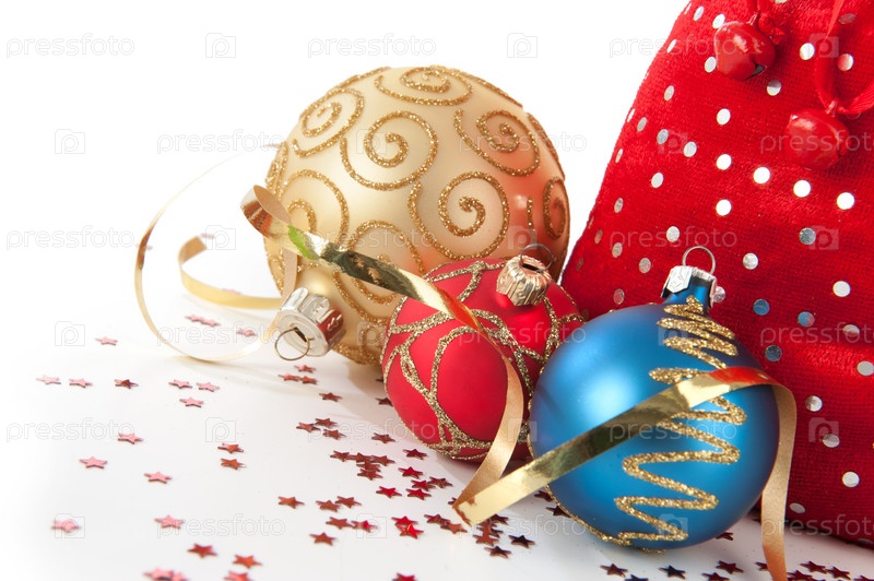 Красный мешок Санты с елочными игрушками на белом фоне