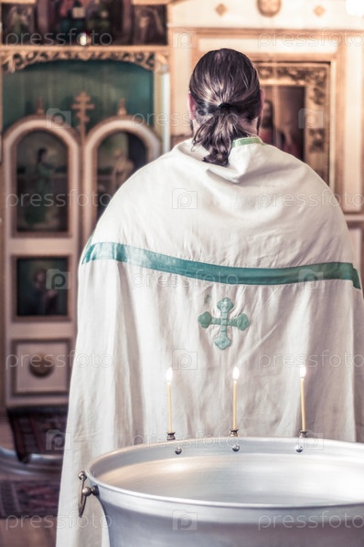 Православный священник в церкви во время молитвы Богу