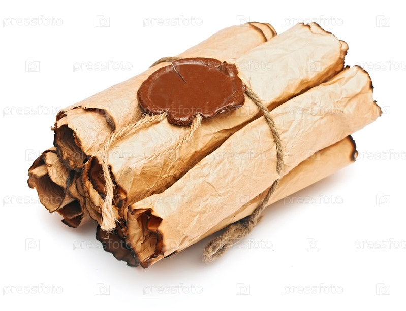 Куча старых бумажных свитков с сургучной печатью на белом фоне