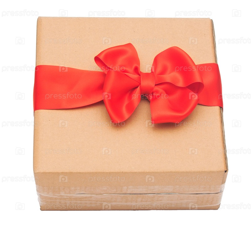 Красная лента на картонной коробке. Праздничный фон
