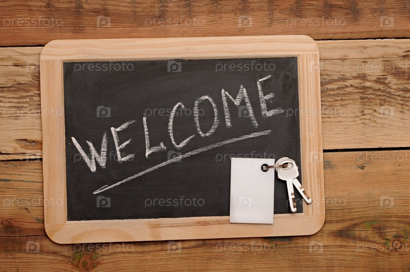 Слово «Добро пожаловать» и ключ на деревянной школьной доске