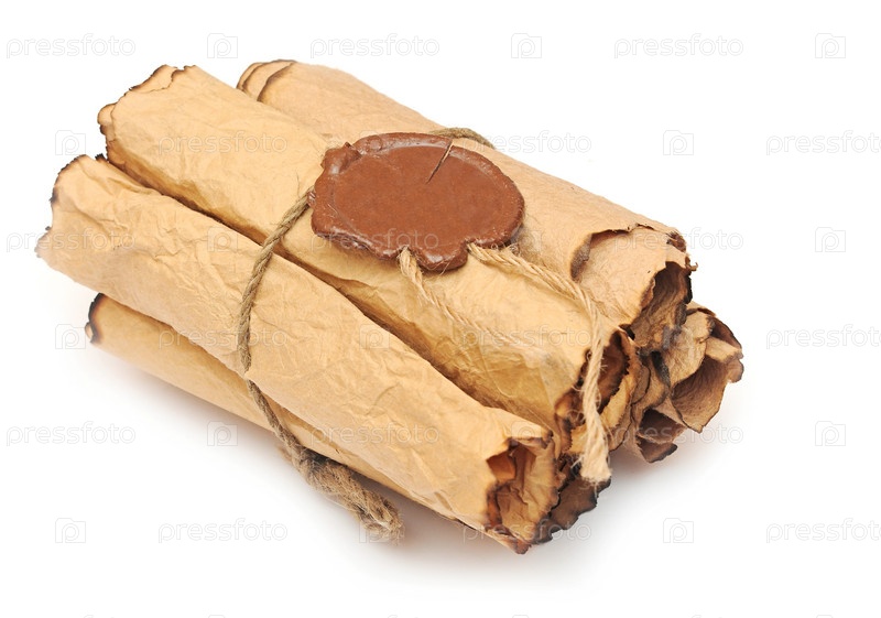 Куча старых бумажных свитков с сургучной печатью на белом фоне