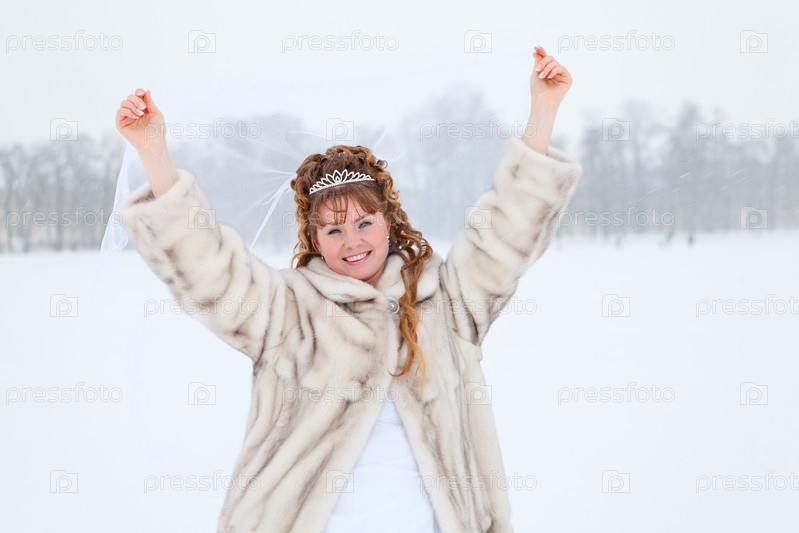 Красивая русская невеста в белом платье и в шубе танцует на снежнрм поле зимой