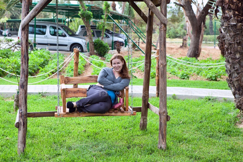 Молодая женщина сидит на садовых качелях