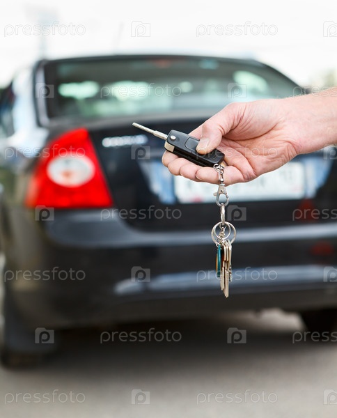 Мужская рука давит на пульт дистанционного управления автомобильной сигнализации