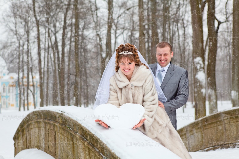 Пара молодоженов держат снежное сердце. Зимний сезон в России