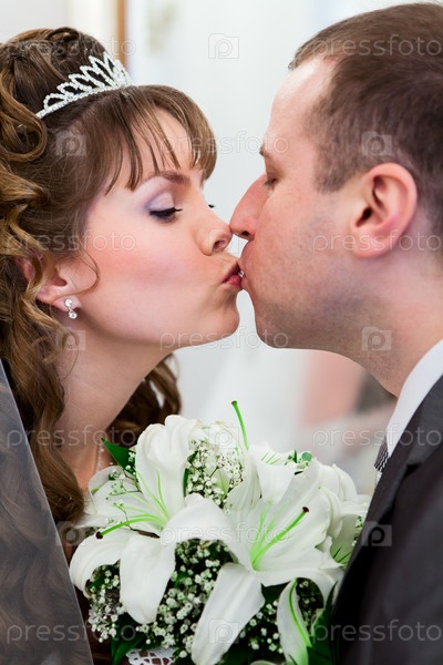 Пара молодоженов целуется