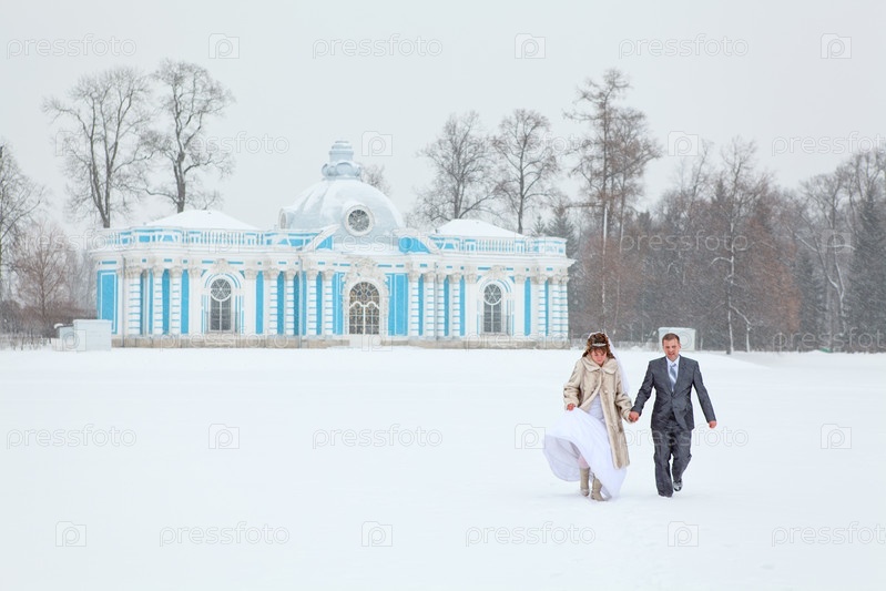 Молодожены держатся за руки на озере зимой