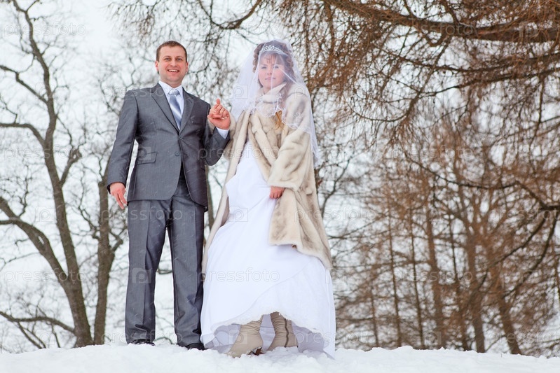 Молодожены стоят в парке. Зимний сезон в России