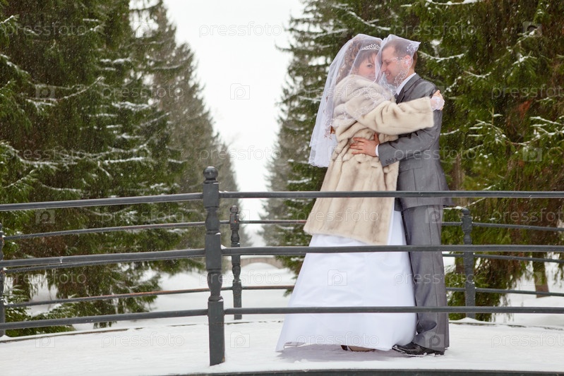 Молодожены стоят в парке. Зимний сезон в России