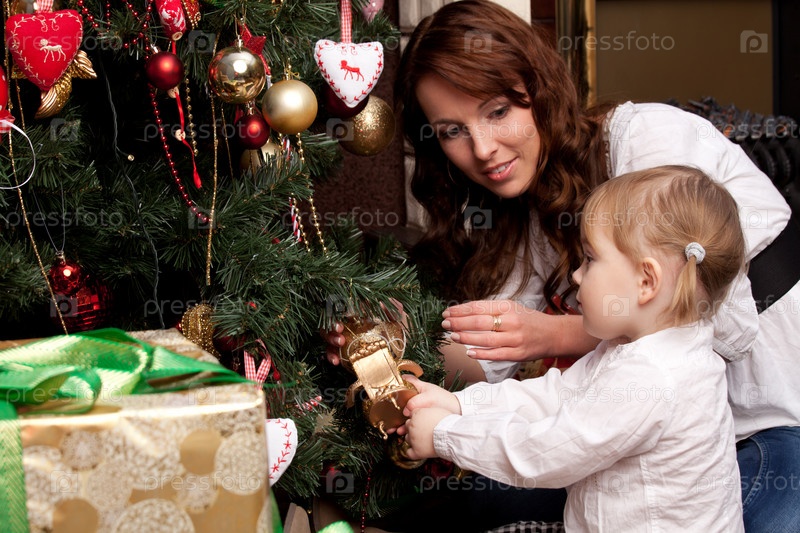 Счастливая мать украшает елку с ребенком
