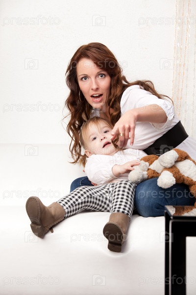 Молодая мать показывает на что-то