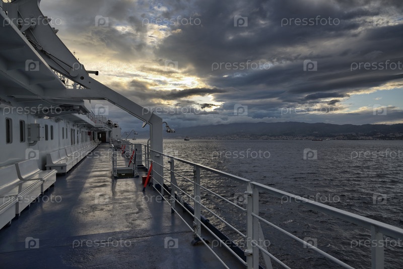 Италия, Калабрия, вид Сицилийского пролива и побережья Сицилии на закате с одного из многих паромов, которые соединяют Калабрию с Сицилией
