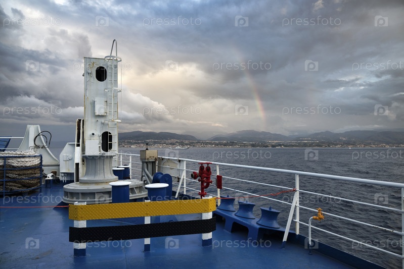 Италия, Калабрия, вид Сицилийского пролива и побережья Сицилии на закате с одного из паромов, которые соединяют Калабрию с Сицилией