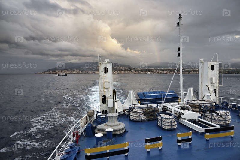 Италия, Калабрия, вид Сицилийского пролива и побережья Калабрии на закате с одного из паромов, которые соединяют Калабрию с Сицилией