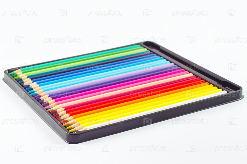 Набор цветных карандашей в коробке на белом фоне