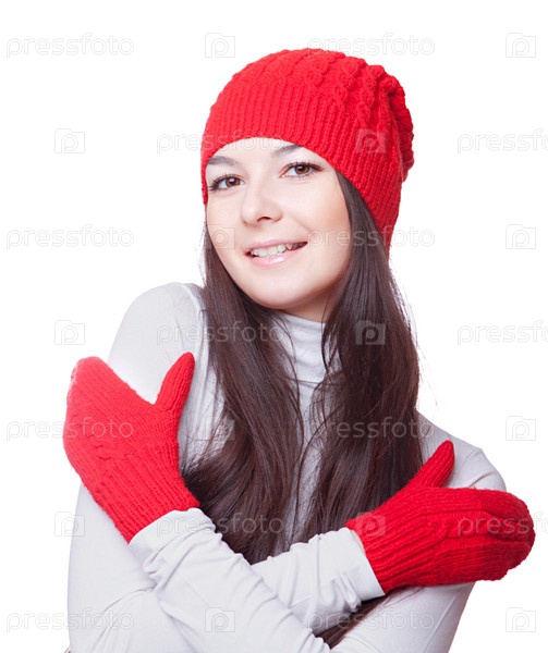 Женщина в красной шапочке обнимает себя