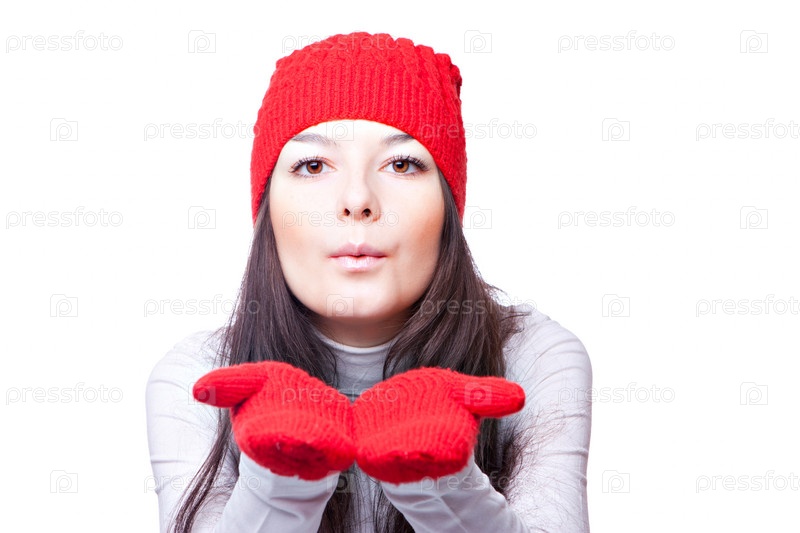 Красивая женщина в красной шапочке и варежках