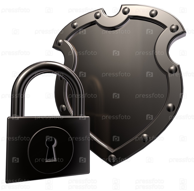 Металлический щит и замок на белом фоне - 3d иллюстрация