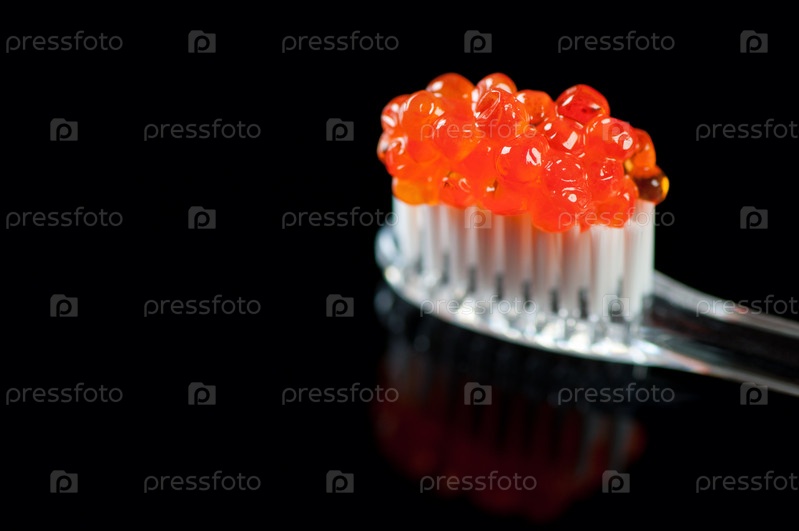 Зубная щетка с красной икрой вместо зубной пасты на черной тарелке