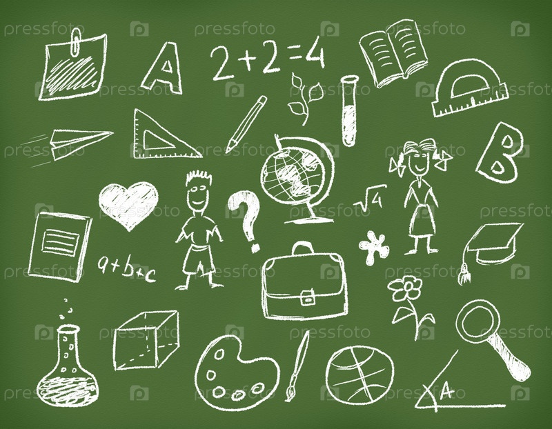Школьная доска со школьными принадлежностями, нарисованными мелом