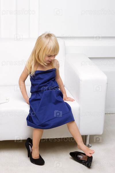 Маленькая девочка стоит в маминых туфлях на каблуке