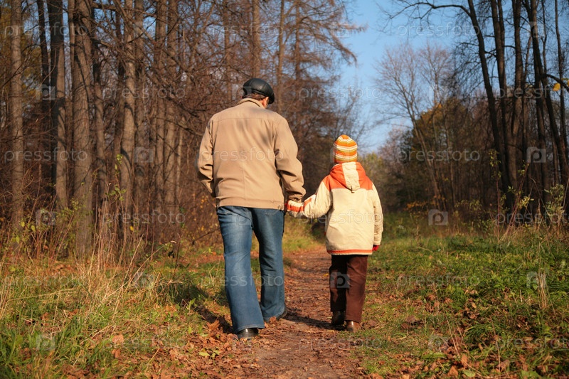 Дед с внуком гуляют в парке