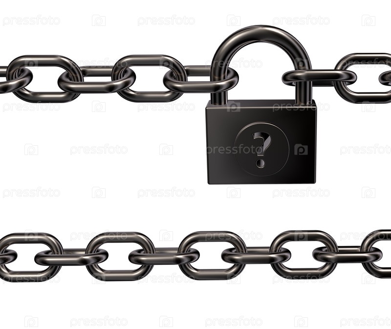 Замок с вопросительным знаком и цепью на белом фоне - 3d иллюстрация