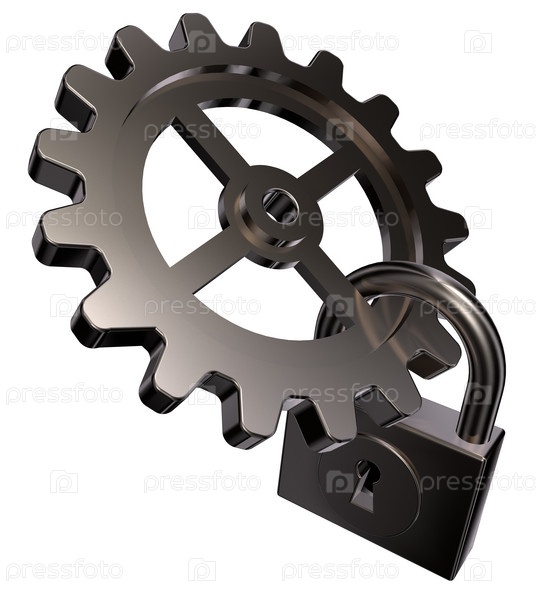 Зубное колесо и замок на белом фоне - 3d иллюстрация